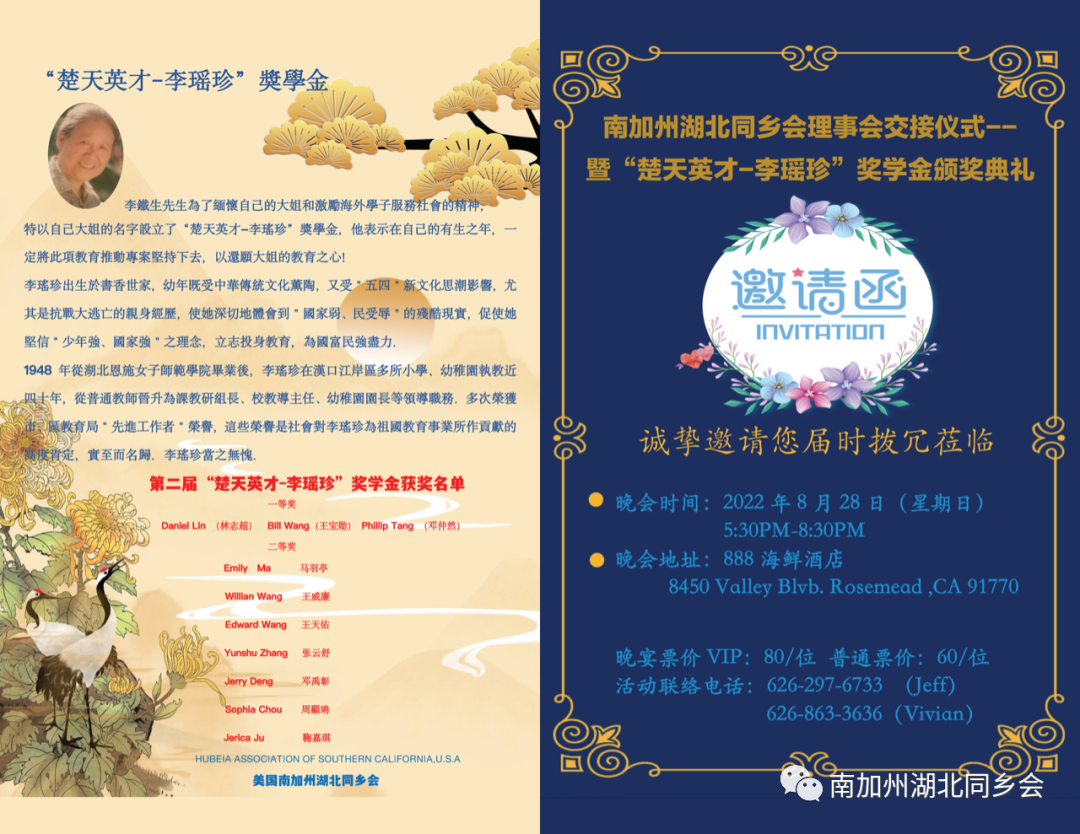 2022年8月28日美国南加州湖北同乡会,在888海珍大酒楼盛大举行第十届理事会就职典礼暨第二届 “楚天英才”李瑶珍奖学金颁奖仪式,洛杉矶各界知名侨领代表纷纷到场祝贺,中国驻洛杉矶总领馆也派代表参加典礼仪式。